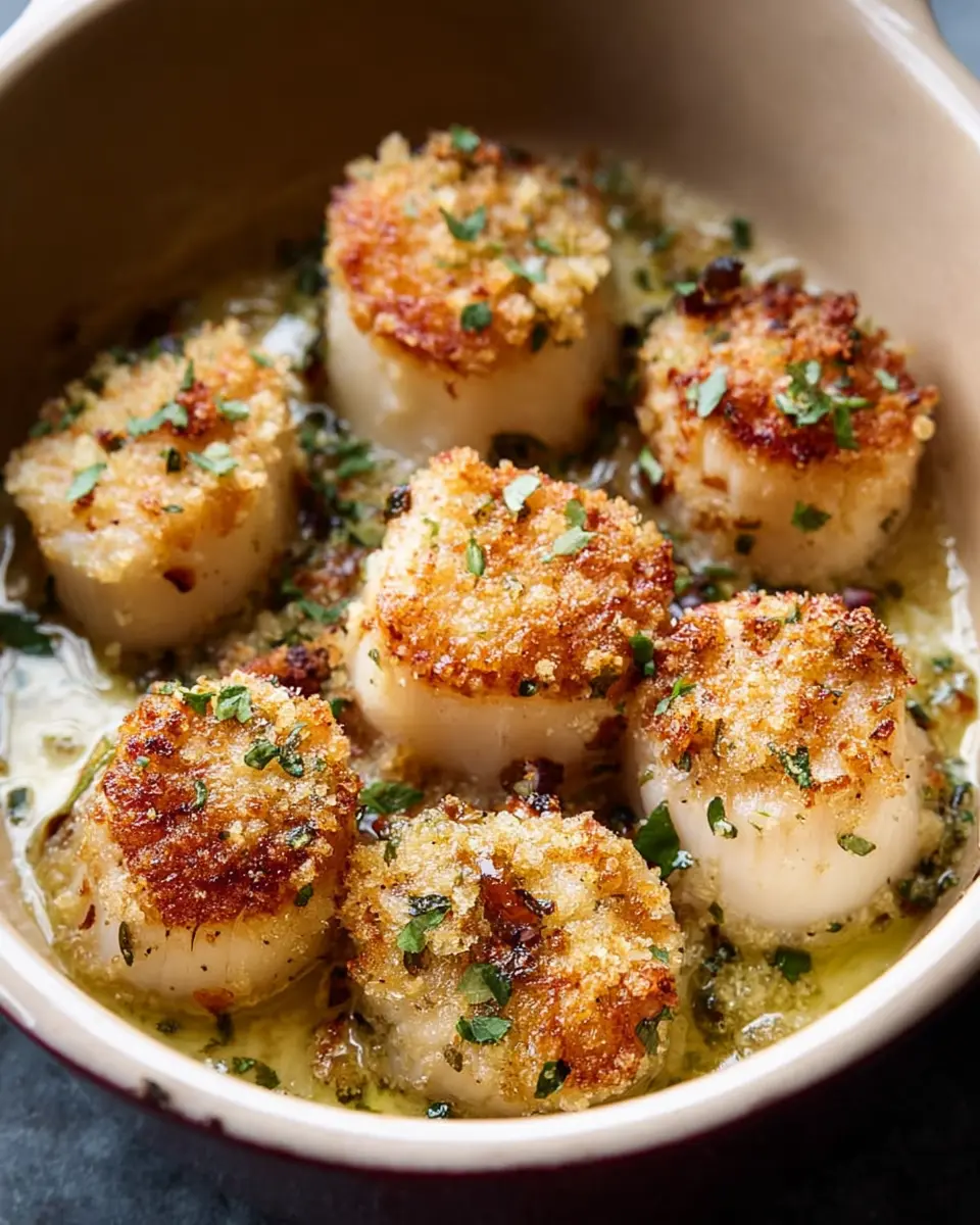 In a small skillet, melt 5 tablespoons of unsalted butter over medium heat. Drizzle about 2 tablespoons of this melted butter over the scallops. Then, toss the minced garlic and ½ cup of panko breadcrumbs into the skillet and sauté everything until the mixture is lightly toasted and fragrant—this should take about a minute. It’s this step that creates that irresistible crunchy topping!