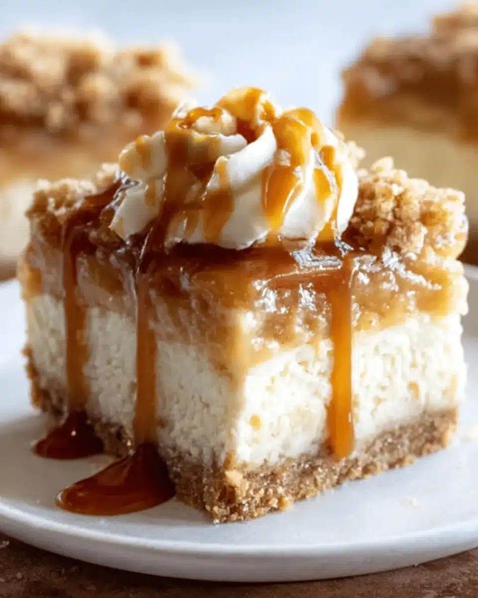 Presentation is key when serving your caramel apple cheesecake bars. Try arranging them on a wooden board with apple slices and a drizzle of extra caramel around for a rustic look. Alternatively, serve individual bars on small dessert plates with a dollop of whipped cream and a sprinkle of crushed nuts or extra streusel topping for added texture. Let your creativity shine and make every serving a delight!