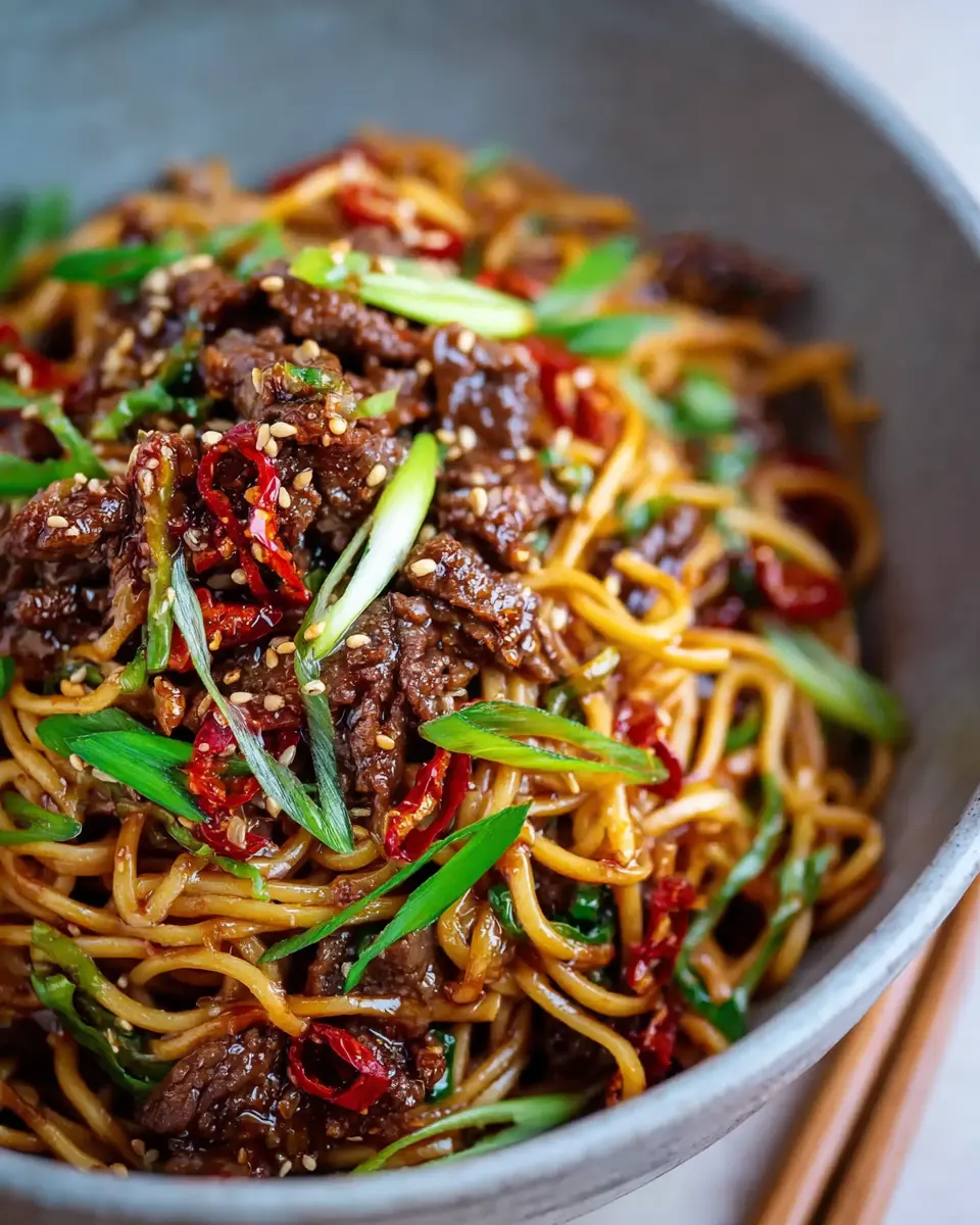 To achieve that glossy, sticky sauce that makes these noodles irresistible, mix ½ cup water with 1 tablespoon cornflour in a small bowl. Pour this mixture into your beef and veggie stir-fry, stirring constantly for about 1–2 minutes until the sauce thickens up and sticks to everything nicely.