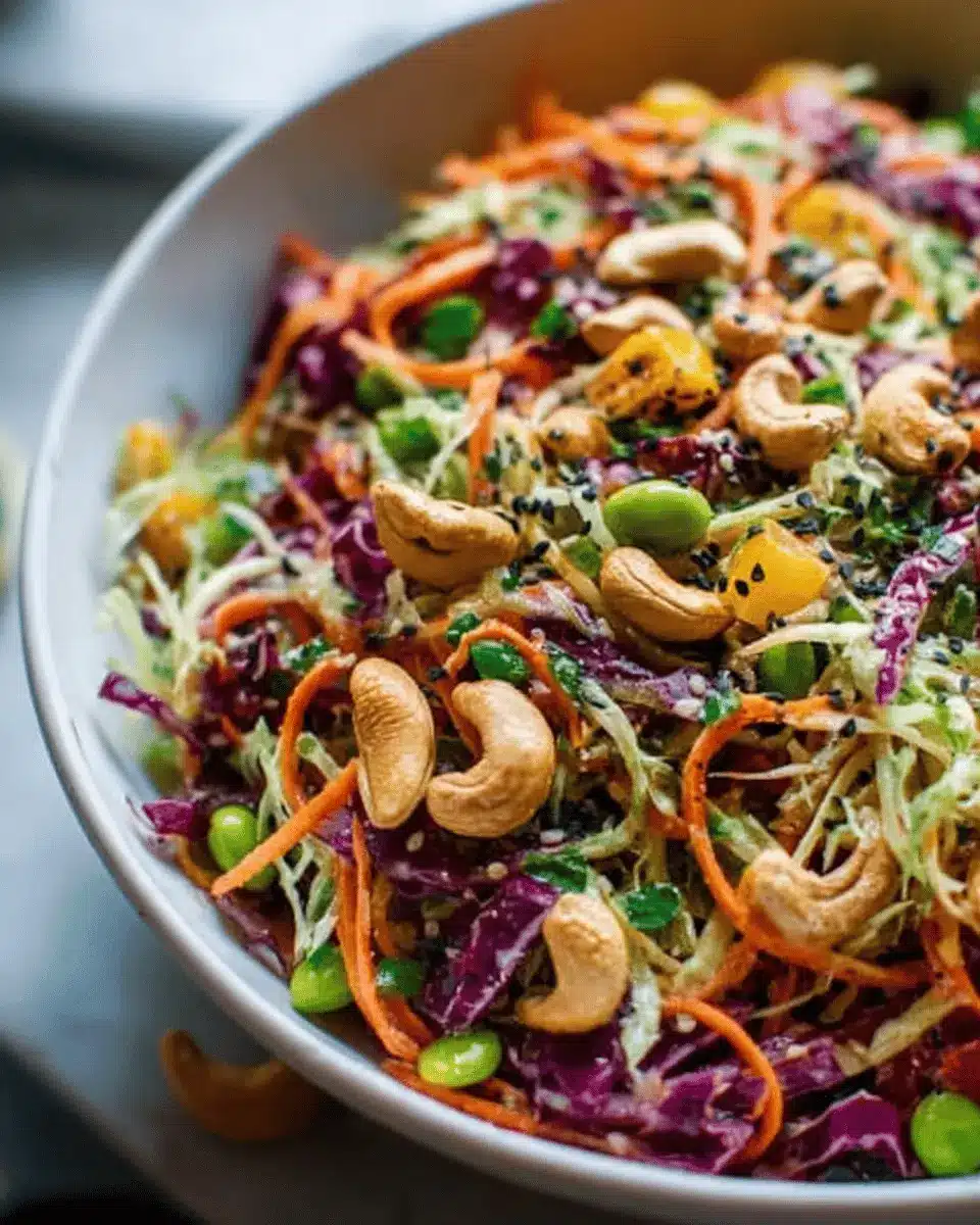 Grab a large mixing bowl and start layering your cashew crunch salad. Begin with the shredded green and purple cabbage, then add the carrots, cilantro, and green onions. This colorful base is not only visually appealing but also packs a nutritious punch. Each ingredient plays a crucial role: crunchy, fresh, and vibrant—talk about a salad that wows!