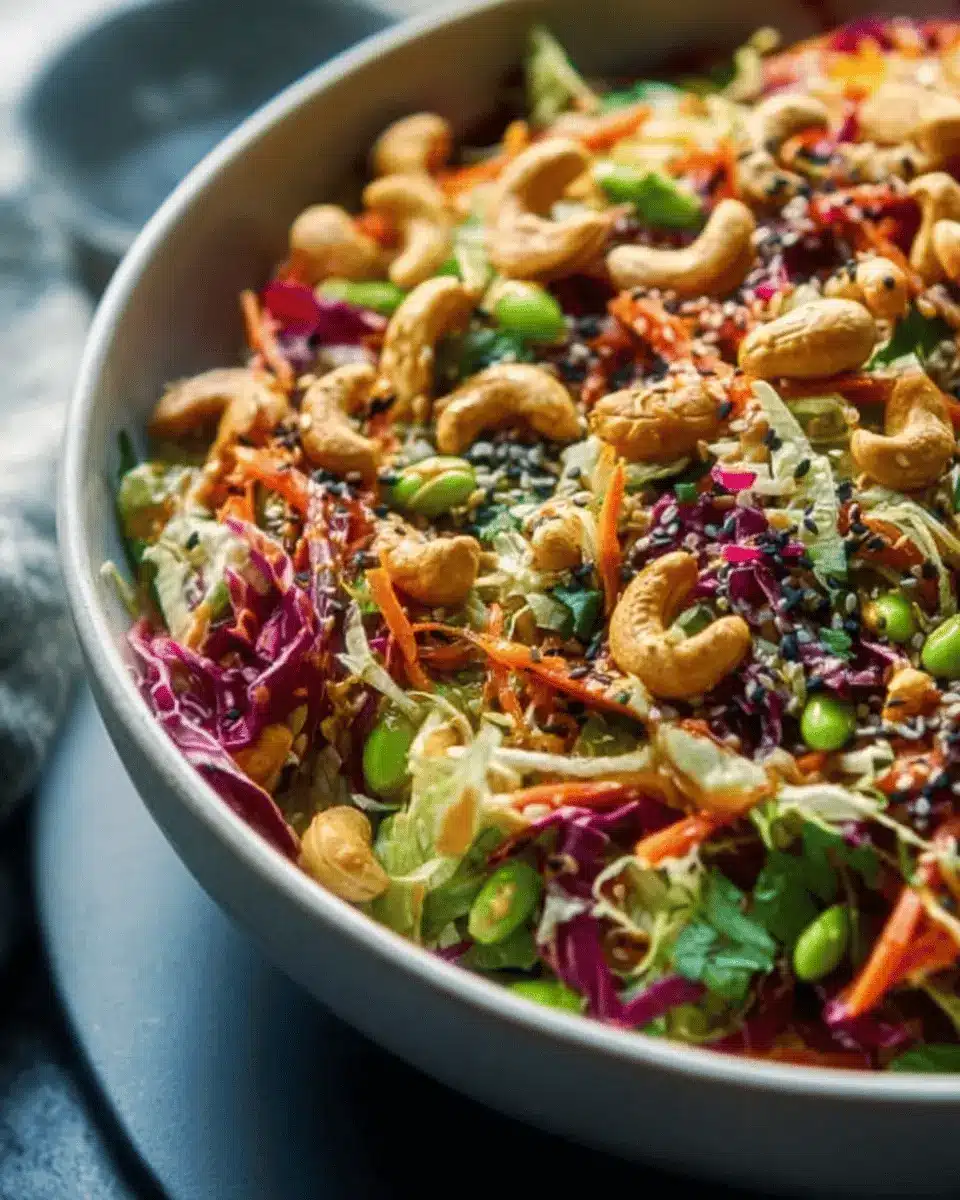 Now for the fun part! In a large mixing bowl, combine all the prepared salad ingredients: the cabbages, carrots, cilantro, green onions, edamame, cashews, and any protein you’ve chosen. Drizzle your sesame dressing over the top and gently toss everything together until the salad is well coated. Feel free to adjust the amount of dressing based on your taste.