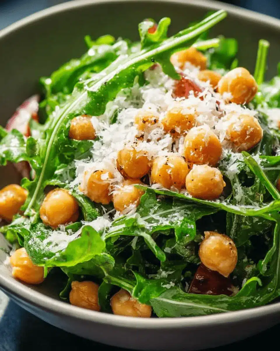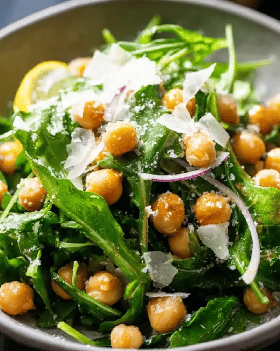 Elevate your Chickpea Arugula Salad presentation with a few simple tricks. Use a large, shallow bowl or a wooden platter for a rustic touch. Arrange the ingredients in distinct layers for visual appeal: start with the chickpeas and arugula, add the red onion, and finish with a beautiful cascade of shaved Parmigiano Reggiano.
