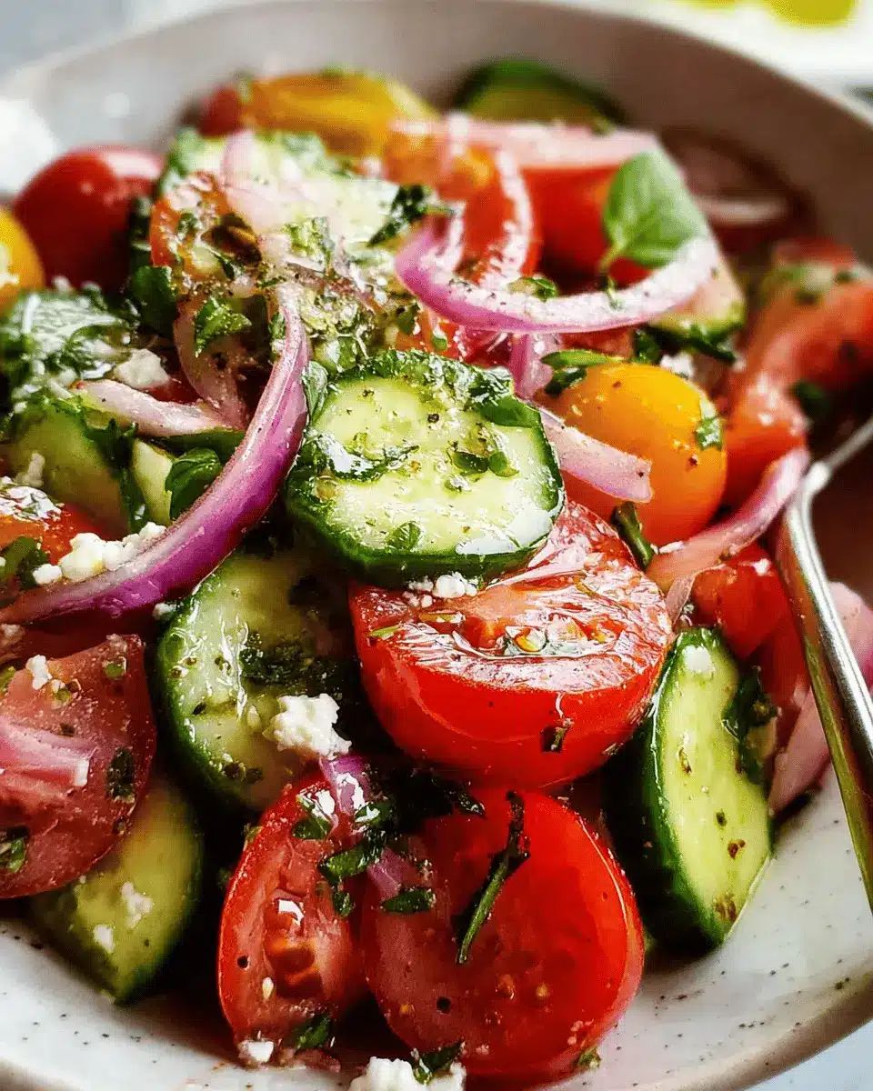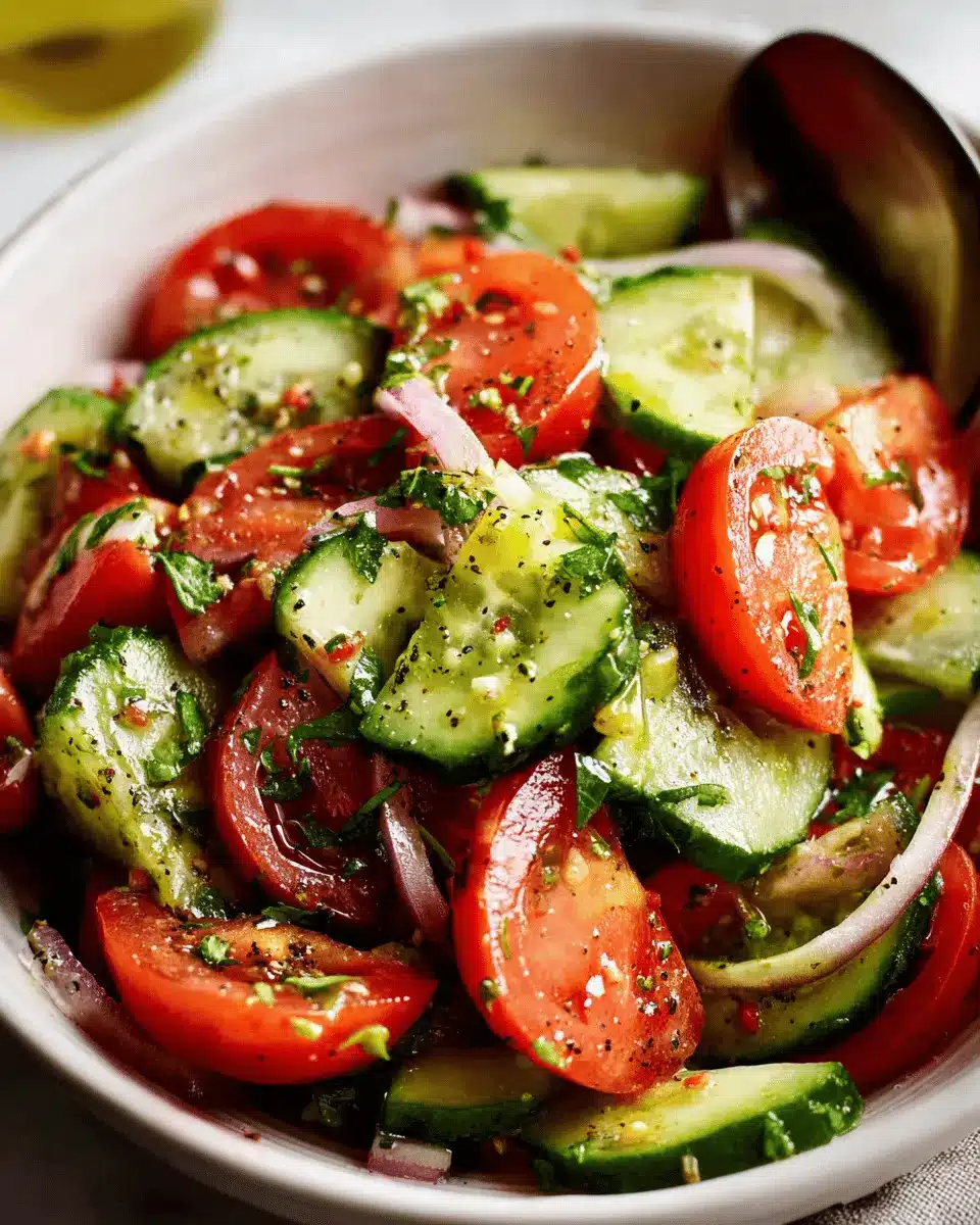 Feel free to get creative with the dressing! Start with the base of lemon juice and olive oil, then personalize it to your taste. Add a dash of honey for sweetness, a sprinkle of crushed red pepper for heat, or swap in balsamic vinegar for a richer flavor. Experiment with herbs like oregano or tarragon to give your cucumber tomato salad a unique twist. The beauty of this dish lies in its versatility—make it yours!