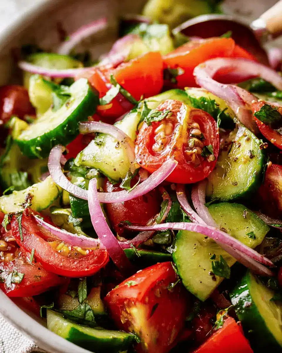 In a large mixing bowl, combine the sliced cucumbers, chopped tomatoes, and red onion. Pour your delicious dressing over the top and toss gently. Be careful not to mash the tomatoes; you want everything to remain whole and vibrant.
