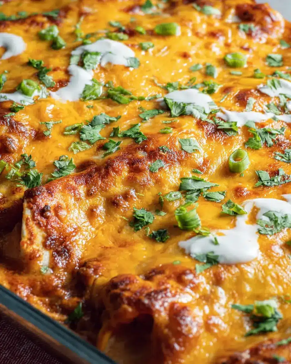 Once you have all your enchiladas lined up in the dish, pour the remaining enchilada sauce over the top, making sure each tortilla is generously covered. Don’t be shy with that cheese—sprinkle the remaining grated cheddar on top for that gooey, melty goodness!