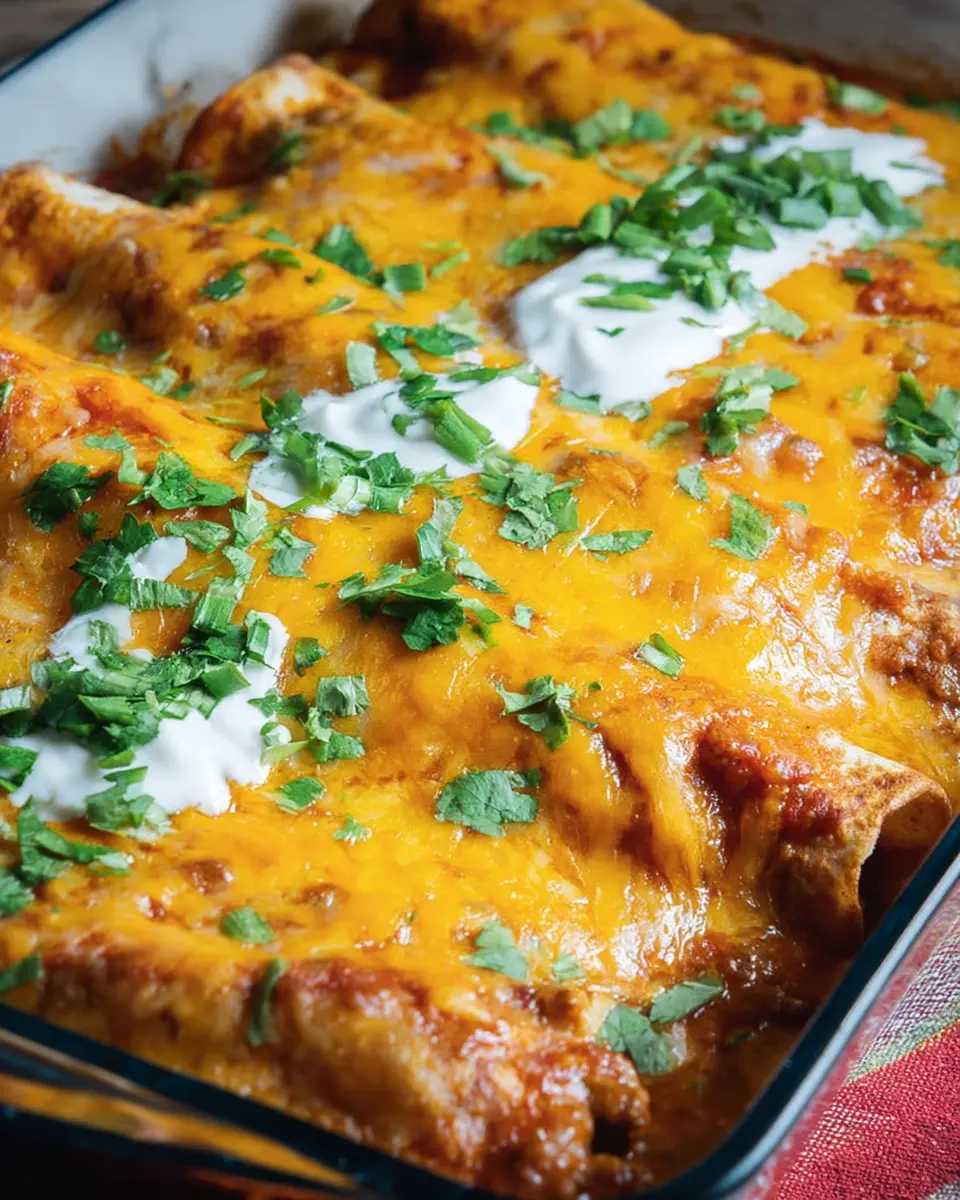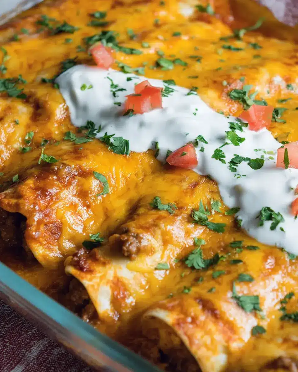 Pop the dish in the oven and bake for about 20 minutes. You’ll know they’re ready when the sauce is bubbly and the cheese is gloriously melted. Serve your easy cheesy ground beef enchiladas with a dollop of sour cream and a sprinkle of fresh cilantro for a touch of freshness. Enjoy the mix of flavors and the compliments that are sure to follow!