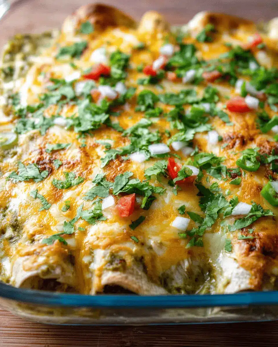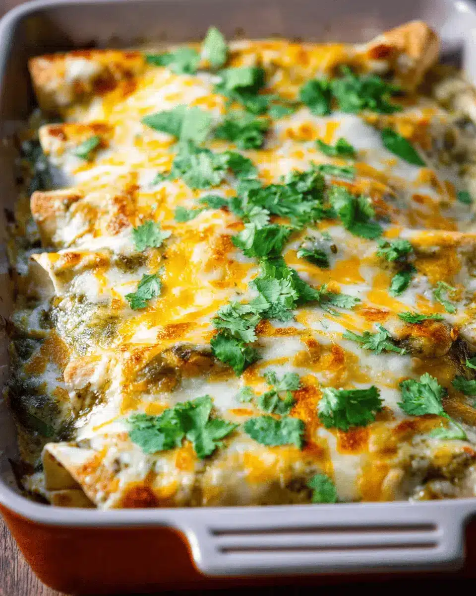 Cover your baking dish with aluminum foil and place it in the preheated oven for 15 minutes. After that, remove the foil and bake for an additional 10 minutes or until the cheese is bubbling and golden. For the final touch, let your enchiladas rest for about 5 to 10 minutes before serving. This allows them to set up beautifully. Garnish with some extra cilantro, and you're ready to enjoy a plate of truly delightful easy green chicken enchiladas!