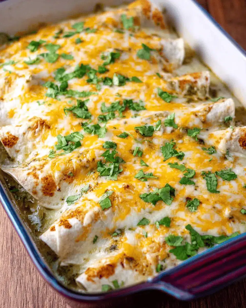 The preparation time for these easy green chicken enchiladas is a quick 10 minutes. This gives you just enough time to gather your ingredients and whip up the creamy sauce that ties everything together.