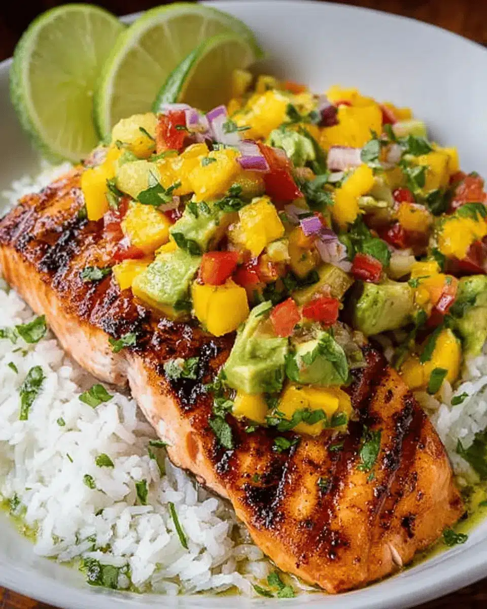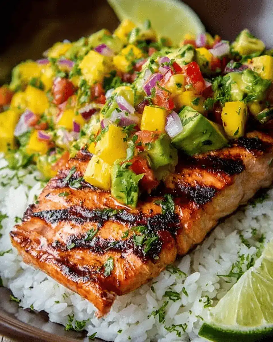 Grilled Lime Salmon with Avocado-Mango Salsa and Coconut Rice