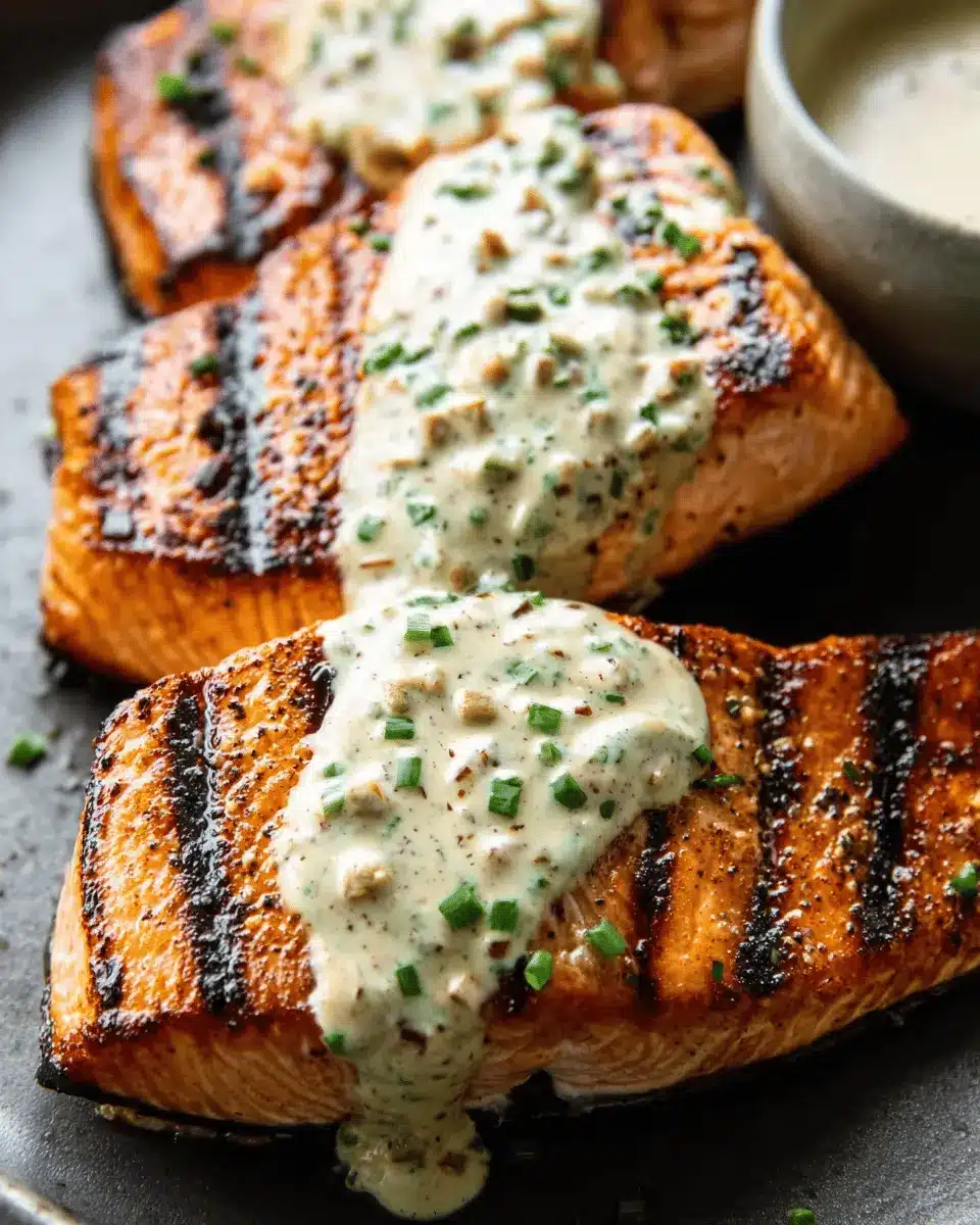 Once your grilled salmon steaks are cooked through and beautifully charred, it’s time for the final presentation. Place one steak on each plate, then drizzle a generous serving of your creamy mustard chive sauce over the top.