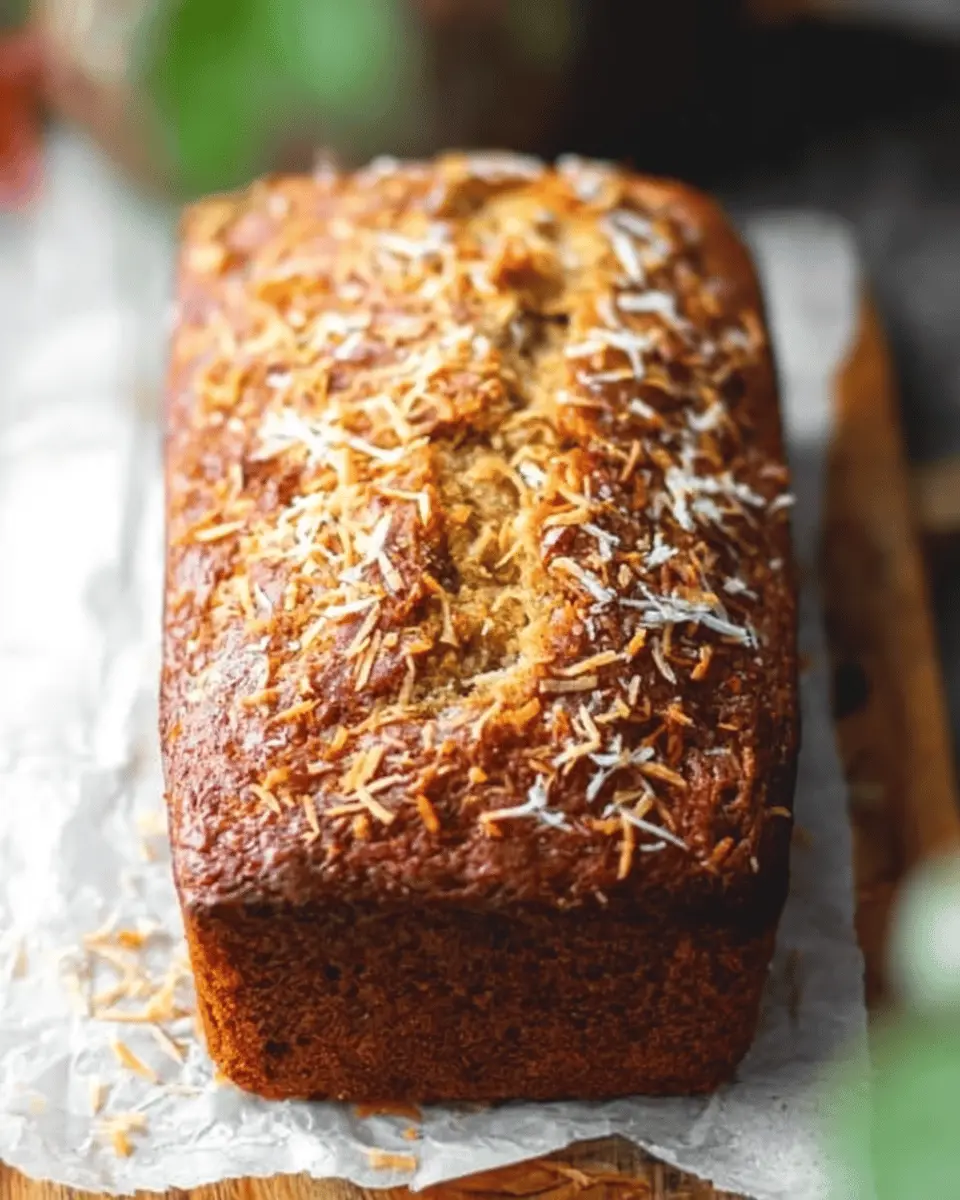 Pour your luscious batter into the prepared loaf pan. For an extra touch of flavor and texture, you can sprinkle some shredded coconut on top before baking. Place it in the oven and let it bake for 40-45 minutes, or until the top is golden brown and a toothpick inserted into the center comes out clean.