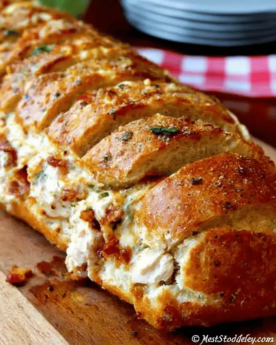 Your Chicken Bacon Ranch Stuffed Bread is now ready to serve — enjoy the savory goodness with friends and family!