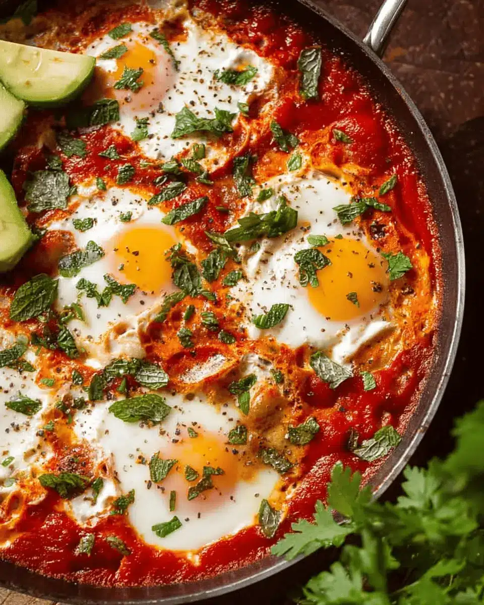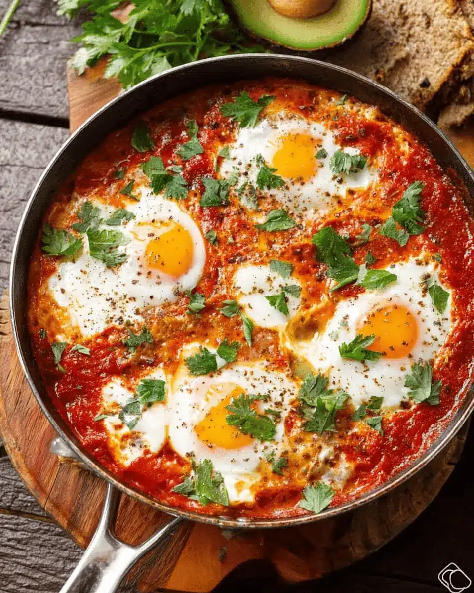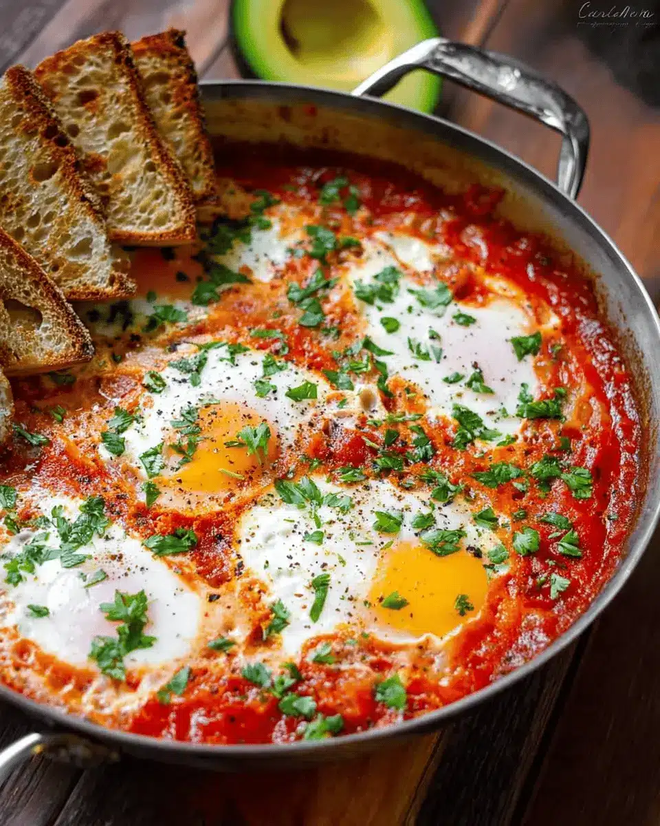 Once your eggs are perfectly poached, it’s time to plate! Remove the skillet from heat and garnish your shakshuka with fresh cilantro or parsley. For an extra touch of indulgence, consider adding slices of avocado or your favorite cheese. Serve this delightful dish hot, accompanied by toasted bread for the ultimate dipping experience!