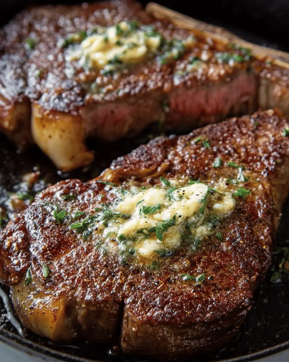 After flipping, it’s time for some flavor magic! Reduce the heat to medium-low and add 2 tablespoons of unsalted butter, along with the smashed garlic cloves and a few sprigs of fresh thyme. As the butter starts to foam, tilt the pan slightly, allowing the butter to pool, and baste the melted goodness over your steaks. This step infuses the meat with rich flavors and elevates the overall dish.