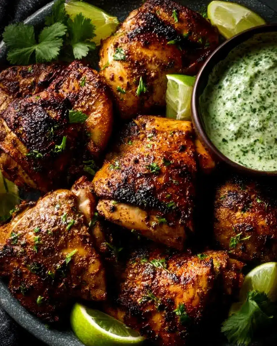 Moreover, this dish offers versatility. Whether you prefer grilling on the weekend or baking during a weekday rush, it adapts to your cooking method of choice. Plus, the accompanying creamy green sauce, bursting with fresh herbs and tangy jalapeños, adds an irresistible kick to your grilled chicken.