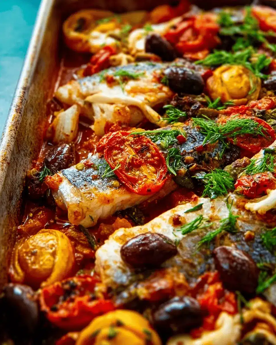 Finishing touches can elevate your dish significantly. Here, a handful of fresh basil leaves is a must; their aromatic flavor beautifully ties in with the overall theme. Don’t forget to sprinkle some more fennel fronds on top for an added pop of freshness and a lovely visual appeal. A light drizzle of extra virgin olive oil right before serving can also bring out the flavors beautifully, making your Puttanesca fish tray bake a feast for both the eyes and the palate.