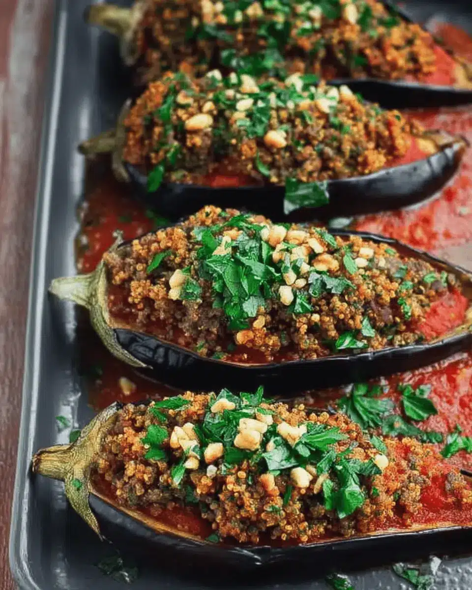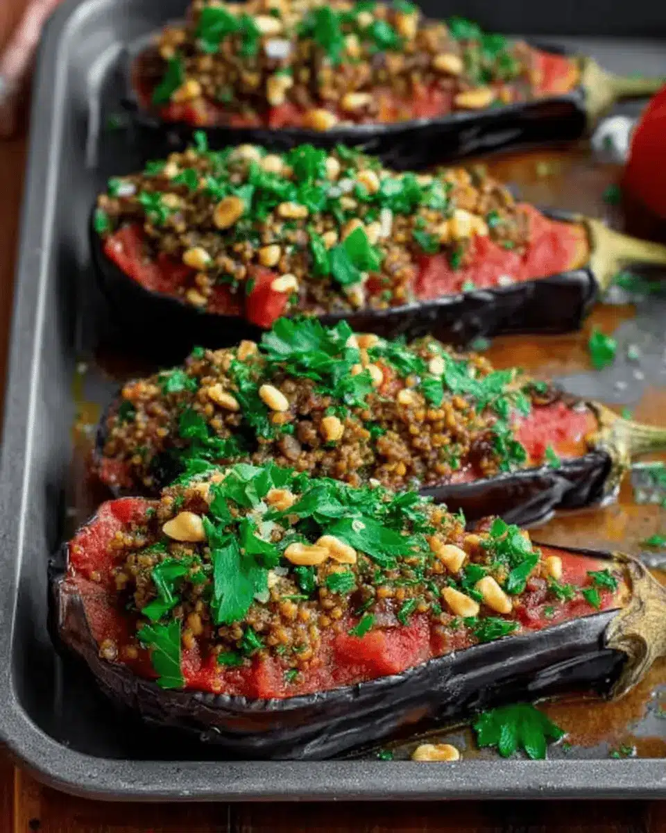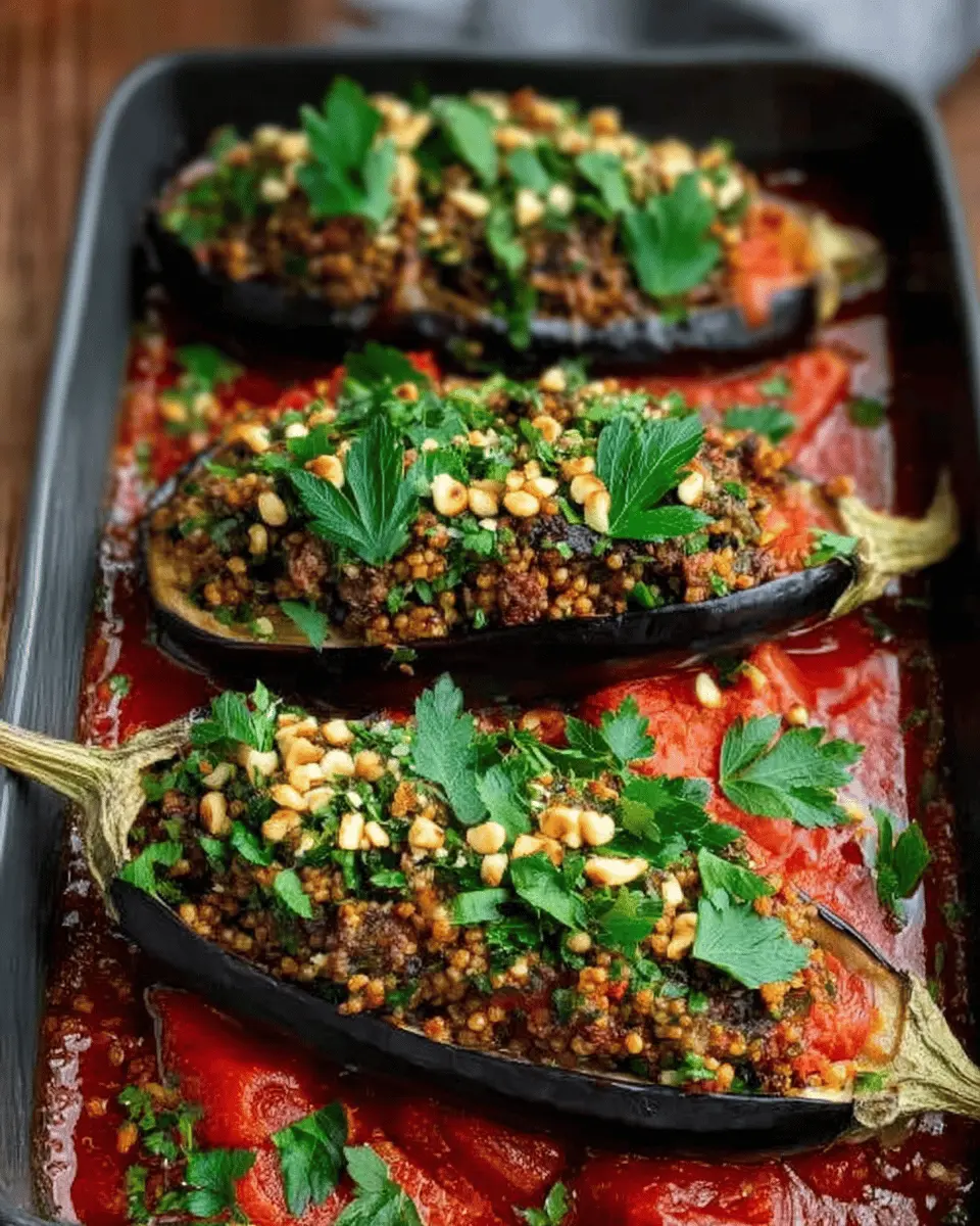 Stuffed Eggplant Recipe with Spiced Ground Beef, Bulgur and Pine Nuts
