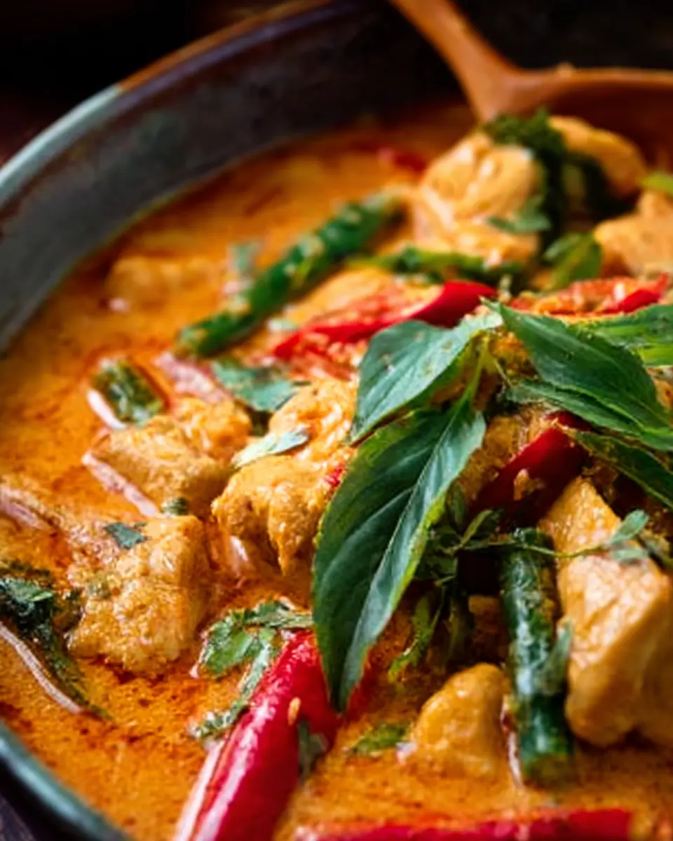 Finally, it’s time to add your veggies! Stir in the pumpkin and green beans, letting them cook for about three more minutes until they’re tender but firm. This adds both texture and a pop of color to your dish. Once it’s cooked, sprinkle a handful of fresh Thai basil leaves over the top. This adds that signature aromatic touch that makes Thai Red Curry with Chicken irresistible!